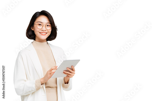 Smiling Asian woman in glasses holds a tablet computer wearing a white blazer and beige turtleneck She looks directly at the camera with a modern and happy expression