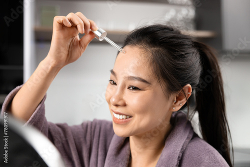 Smiling Asian Woman Using Serum For Skincare Routine At Home. Feeling Content and Fresh, Engaged In Daily Beauty Treatment With Dropper Bottle. Personal Care and Wellbeing Concept.
