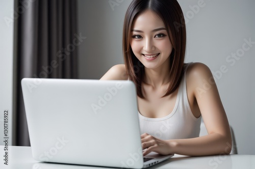 Smiling Asian woman working on laptop at home, freelance, online business, technology, lifestyle, happy, confident