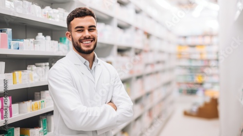 Smiling bearded man in white lab coat stands confidently in well-lit pharmacy aisle, shelves stocked with colorful medications and health products, professional clean atmosphere.