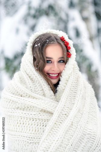 Smiling beautiful woman with a berries in her hair. Winter beauty portrait outdoor