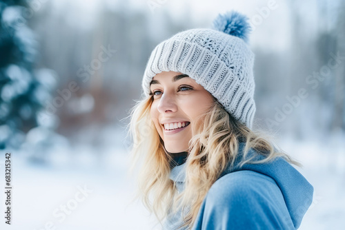 Smiling beautiful young blonde woman portrait with a wool hat on a white winter day snowing