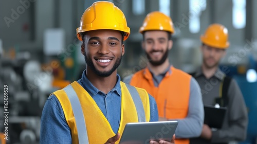 Smiling black construction worker holding tablet with colleagues behind