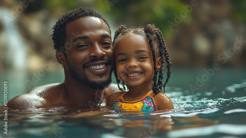 Smiling Black father and young daughter in colorful swimsuit enjoy bonding time together while swimming in a tropical outdoor pool with soft natural background