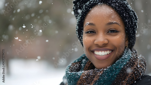 Smiling Black woman in a winter landscape, wearing a cozy scarf and hat, surrounded by falling snowflakes, radiating joy.