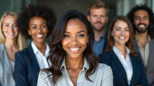 Smiling Black woman with a professional team in a modern office setting.