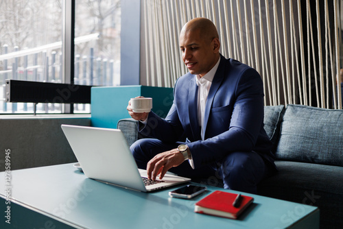 Smiling businessman holding coffee cup and using laptop in hotel lobby