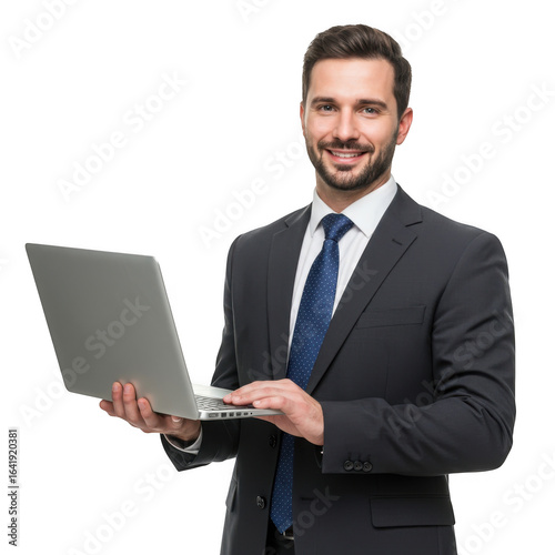 Smiling businessman in a dark suit and blue tie holding a silver laptop and typing with his fingers on the keyboard isolated on transparent background