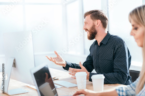 smiling businessman talking to a colleague sitting at his Desk