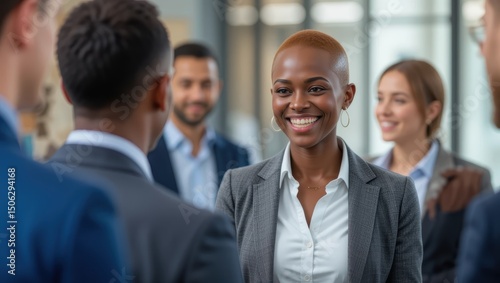 Smiling Businesswoman Engaging in Conversation During Professional Meeting with Diverse Team