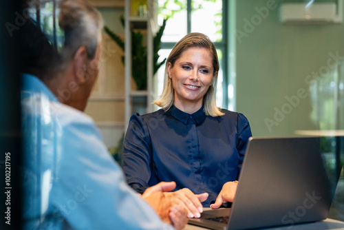 Smiling businesswoman using laptop and discussing with businessman in office