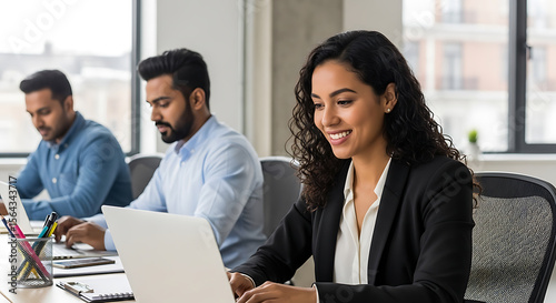 Smiling Businesswoman Working on Laptop in Modern Office with Diverse Colleagues, Professional Team Collaborating in Contemporary Corporate Workspace