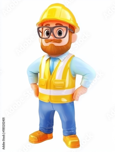 Smiling cartoon construction worker, yellow hardhat and vest.