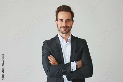 Smiling caucasian man wearing formal business attire on white background. Handsome businessman with confident expression. Modern corporate fashion style. Pro looking gentleman in office setting.