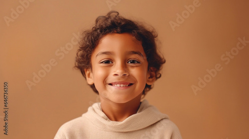 Smiling child in neutral attire captured against a studio's beige backdrop. Generative AI