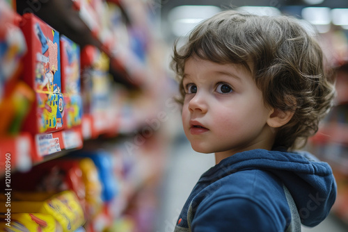Smiling Child Teen Baby Exploring Colorful Toy Store Aisles full shelves, Generative AI