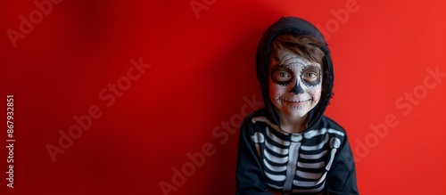 Smiling Child with Face Painted as Skull and Skeleton Costume, Halloween Costume, Solid Red Background with Copy Space.