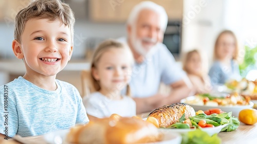 Smiling children and a grandfather enjoying a meal together at a family dinner.
