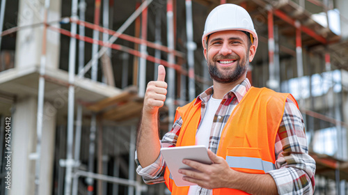 Smiling construction worker with hard hat giving thumbs up in front of scaffolding, holding a tablet.