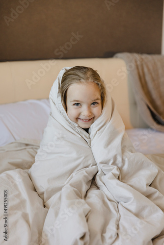 Smiling cute girl wrapped in blanket sitting on bed at home