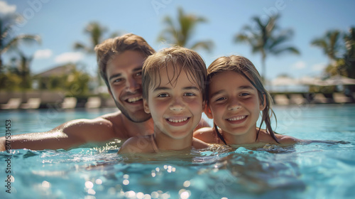 Smiling cute Kids wearing sunglasses in the pool on a sunny day.