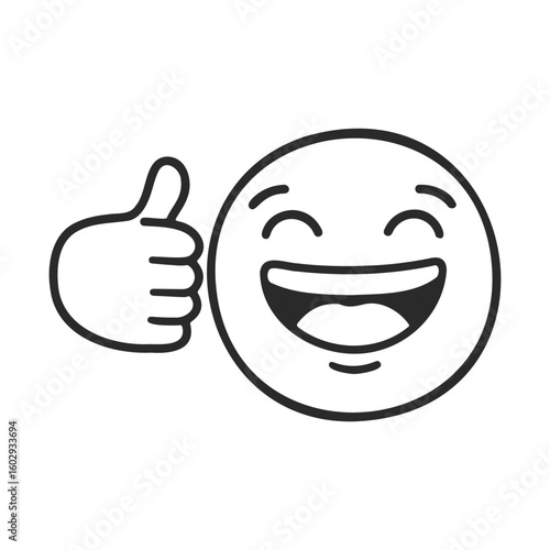 Smiling emoji with thumbs up in black and white line art style – stock vector icon in line style