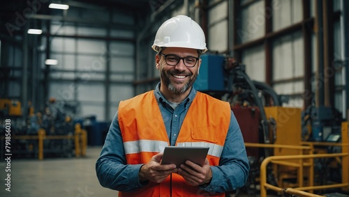 Smiling Engineer Using Tablet in Industrial Facility