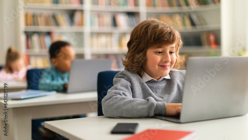Smiling european schoolboy sitting at desk in front of laptop in classroom, typing or doing homework online, panorama