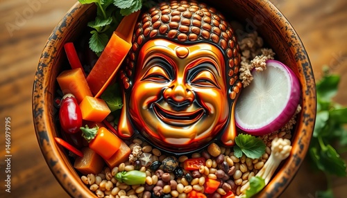 Smiling face reflected in vibrant buddha bowl brimming with colorful vegetables and grains, colorful, clean eating