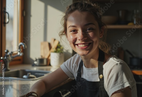 Smiling family cook in a breakfast service area near the preparation space