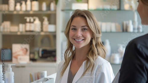 Smiling female skincare specialist wearing a lab coat stands confidently in a professional clinic environment with skincare products on shelves.