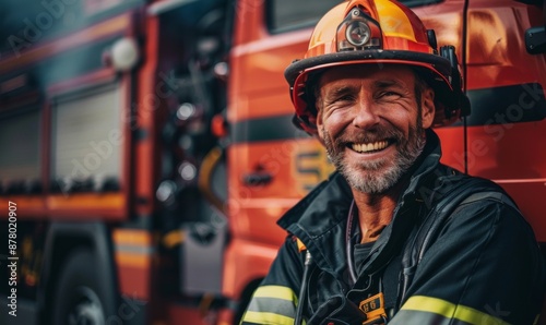 Smiling firefighter in uniform stands proudly in front of a red fire truck