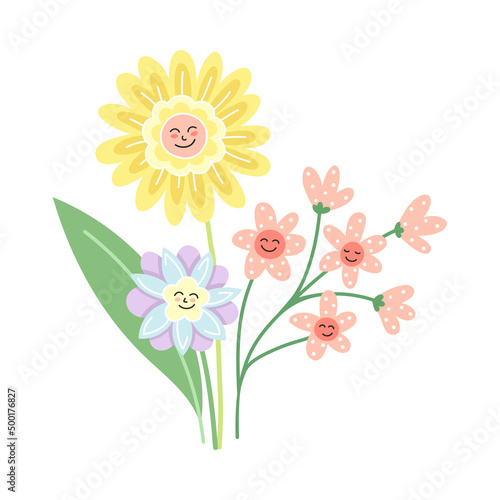 Smiling Flowers on Stalk with Petal and Green Leaf Vector Illustration