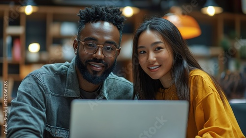 Smiling friends using a laptop together at a cozy café, modern casual setting, teamwork, online learning, friendship, study, relaxed atmosphere, technology.