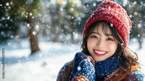 Smiling Girl in Snowy Winter Landscape with Red Hat