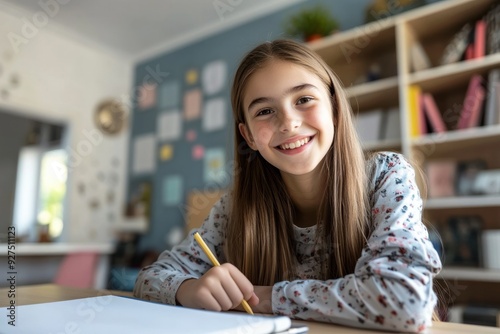 Smiling Girl Studying at Home With Bookshelves in the Background