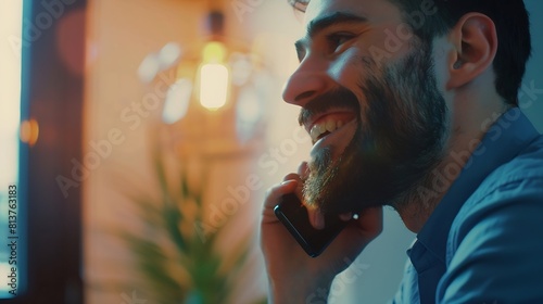 Smiling handsome freelancer working remotely from home He is speaking on the phone : Generative AI