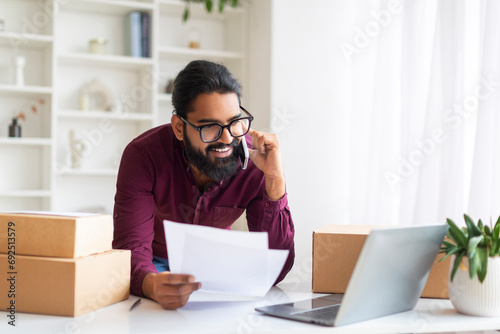 Smiling Indian freelancer verifying shipping documents while on phone call