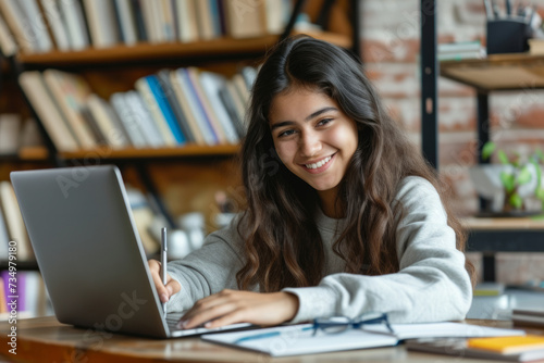 Smiling Latin girl studying with laptop computer. Teenage girl sitting at her desk and writing in notebook. Student doing her homework or learning online.