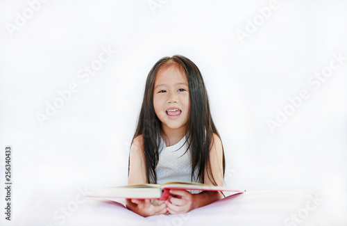 Smiling little Asian kid girl reading hardcover book lying with pillow on bed against white background.