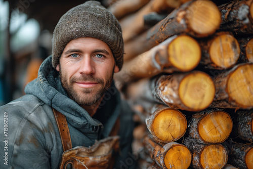 Smiling lumberjack with a pile of cut logs