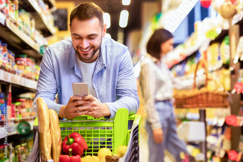 Smiling Male Customer Doing Grocery Shopping Using Smartphone Walking With Cart In Supermarket. Selective Focus. Man Using Groceries Shopping Application On Phone Bying Food In Super Market