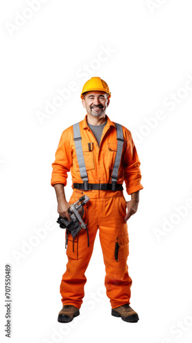 Smiling male engineer standing looking at camera. Isolated. Full body. Transparent background.