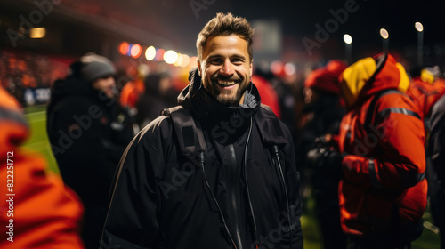 Smiling male photographer wearing a winter jacket at a sports event at night