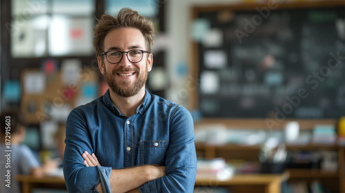 Smiling male teacher with glasses and arms crossed in classroom, students working in background, cheerful and confident educator, modern learning environment