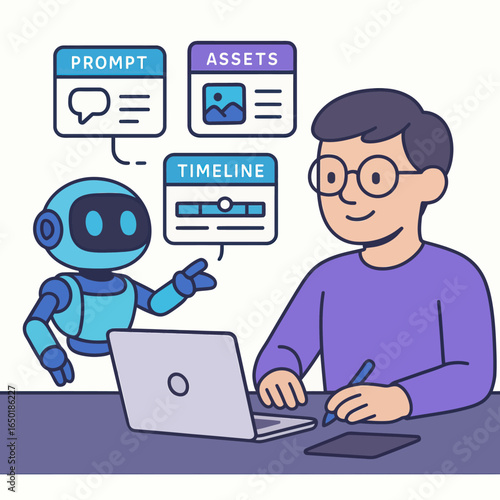 Smiling Man Collaborating with a Friendly Robot on a Laptop.