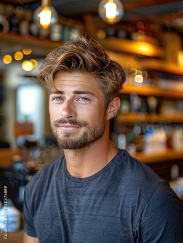 Smiling Man in Casual Shirt at Modern Cafe Setting