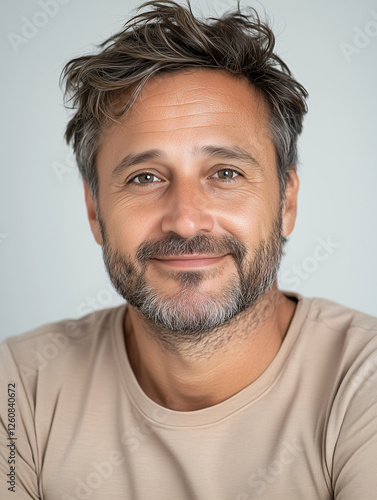 Smiling Man Portrait: A close-up portrait of a middle-aged man with a warm, friendly smile. He has salt-and-pepper hair, a well-groomed beard, and kind eyes that convey approachability and confidence.