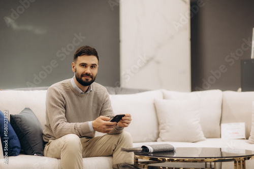 Smiling Man Sitting on Couch Holding Phone in Comfortable Living Room Setting