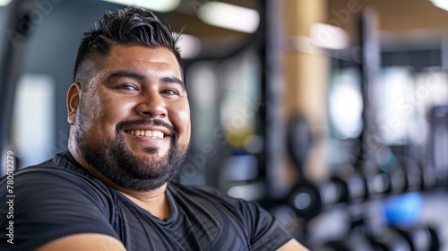 Smiling man with beard in gym sweaty wearing black shirt surrounded by exercise equipment.